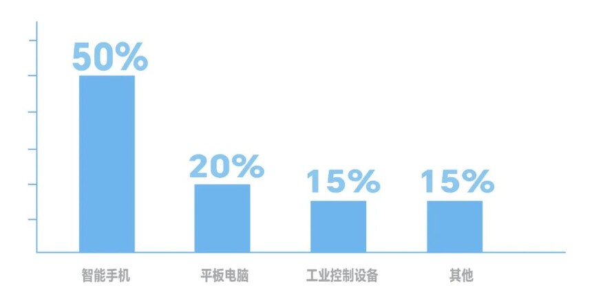 智能手机,最大的应用领域,2020年占比超过50%,主要是各类智能手机触摸屏。
